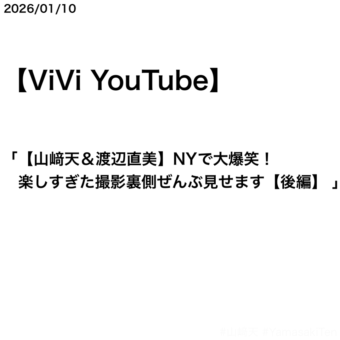 ViVi YouTubeで山﨑天さんのニューヨークVlog後編が公開された。KANEBO、COACHのCM、表紙を務めた『ViVi 2026年1月号』の撮影で訪れた。ViVi Twitterでは、Vlogがシェアされた。
