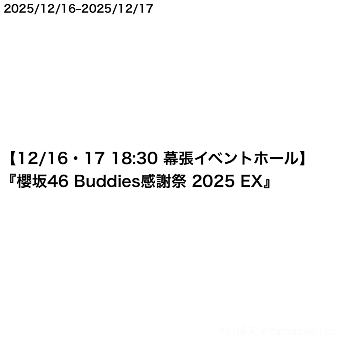 12月16日・17日に幕張イベントホールで『櫻坂46 Buddies感謝祭 2025 EX』が開催されることが発表された。山﨑天さんは櫻坂46のメンバーとして出演する。