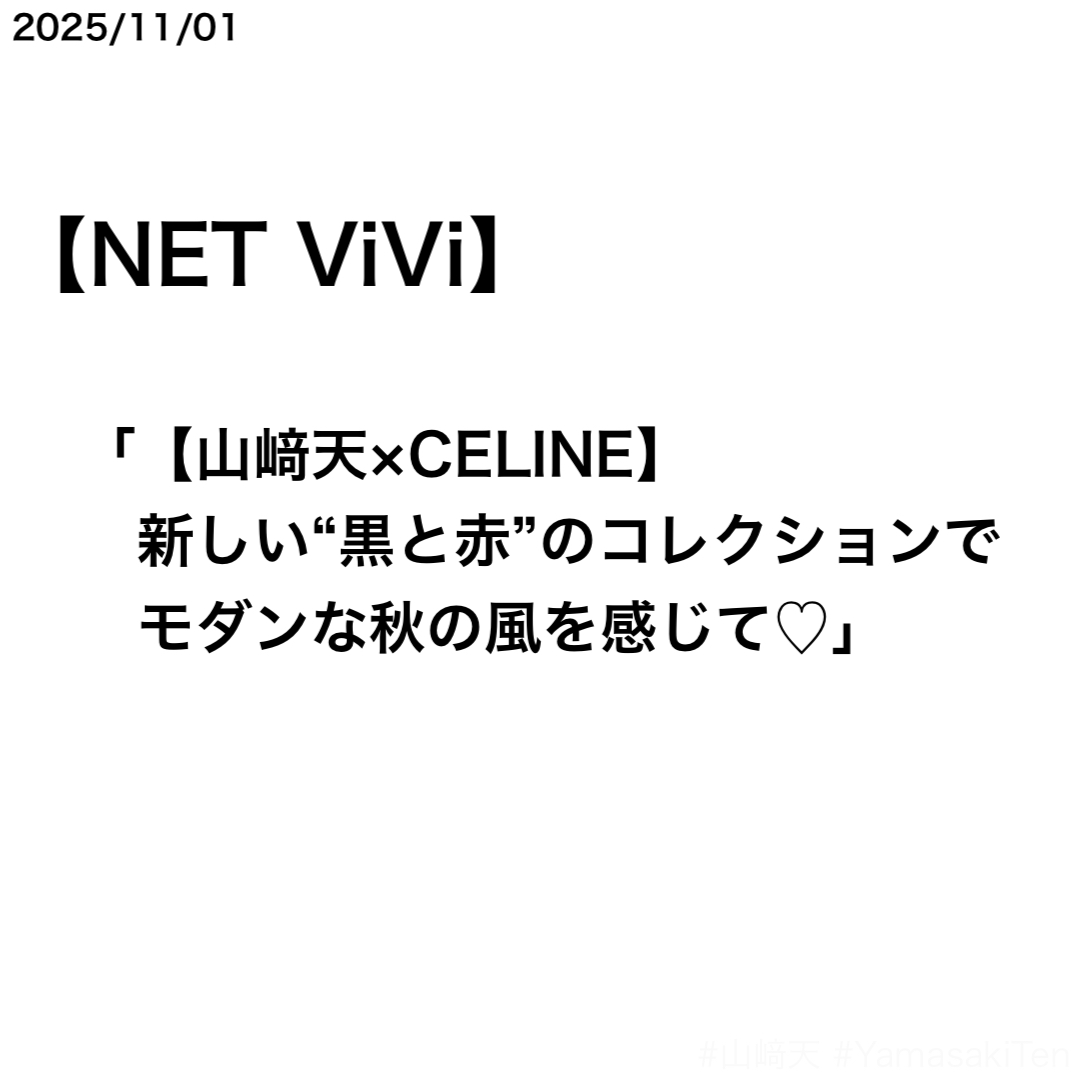 NET ViViで山﨑天さんとCELINEの第1弾記事が公開された。ソロ表紙を務めた『ViVi 2025年12月号』のカバーストーリー「天が魅せる新しい風。」のもの。