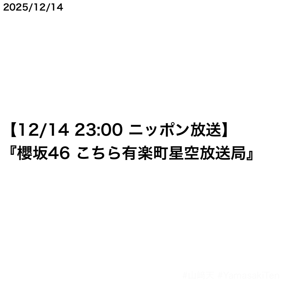 ニッポン放送 公式サイトで発表された。5月18日放送回以来、7か月ぶりの出演となる。今回、放送する企画は「チーム対抗!クリスマスパーティー」。山﨑天さんが『櫻坂46 こちら有楽町星空放送局』の「クリスマス企画」に出演するのは、2023年12月17日放送回、2024年12月15日放送回に続き、3年連続となる。ニッポン放送 公式サイトでは、「こち星のクリスマス企画には絶対に呼ばれる」と紹介された。企画は異なるが、2022年12月18日放送回にも出演しているため、クリスマスの時期に出演するのは、4年連続となった。