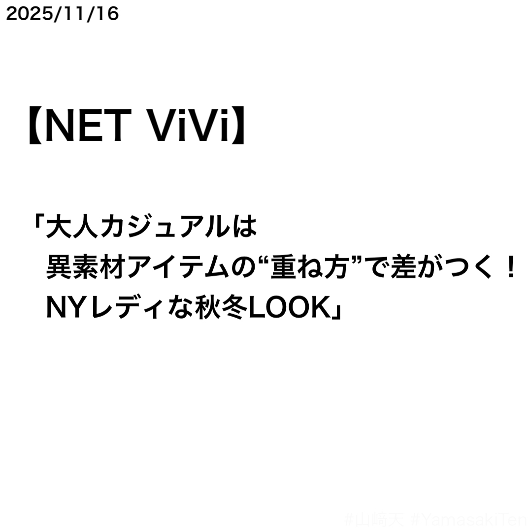 NET ViViで山﨑天さんのニューヨークレディコーデ第3弾記事が公開された。ソロ表紙を務めた『ViVi 2025年12月号』に掲載されている「ViViモの4大ふゆLOOK」のもの。