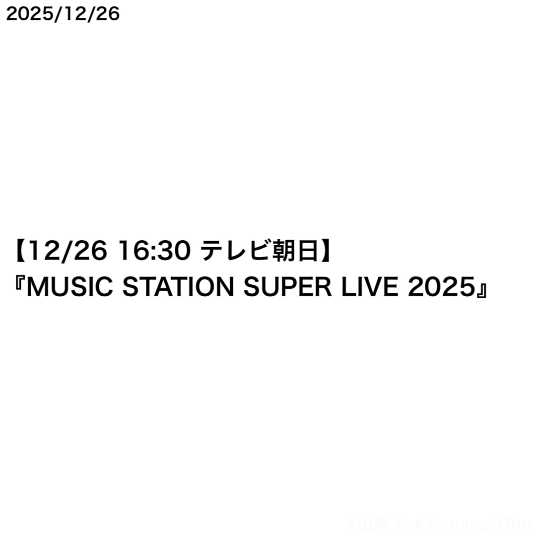 12月26日 16:30から放送の『MUSIC STATION SUPER LIVE 2025』(テレビ朝日)に、山﨑天さんが出演することが決定した。山﨑天さんが『MUSIC STATION』に出演するのは、今回で19回目。歌唱曲は未定。