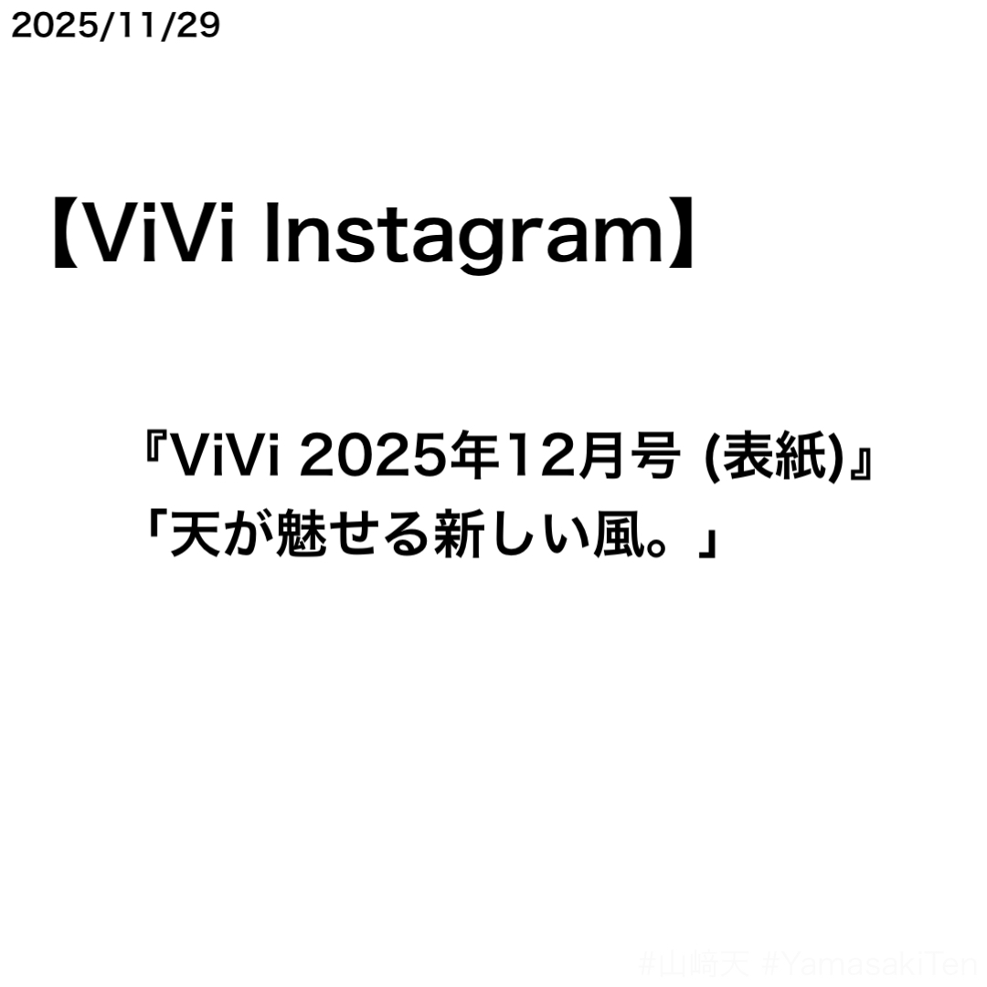 ViVi Instagramで山﨑天さんのCELINEコーデがシェアされた。ソロ表紙を務めた『ViVi 2025年12月号』のカバーストーリー「天が魅せる新しい風。」のもの。