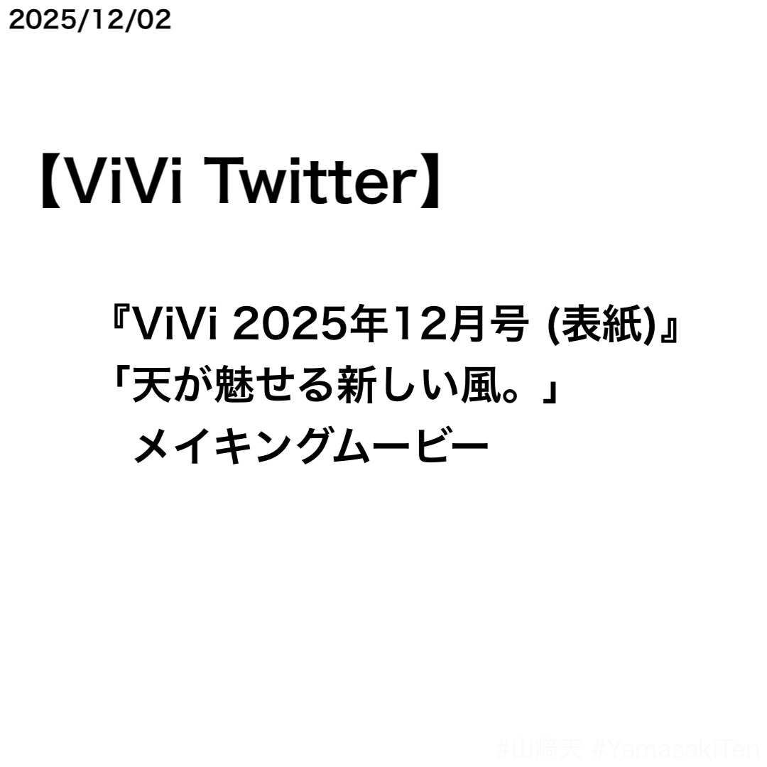 ▶https://t.co/lITP3oSGTd#山﨑天 pic.twitter.com/FmIGBpW0GB— ViVi (@vivi_magazine) December 2, 2025