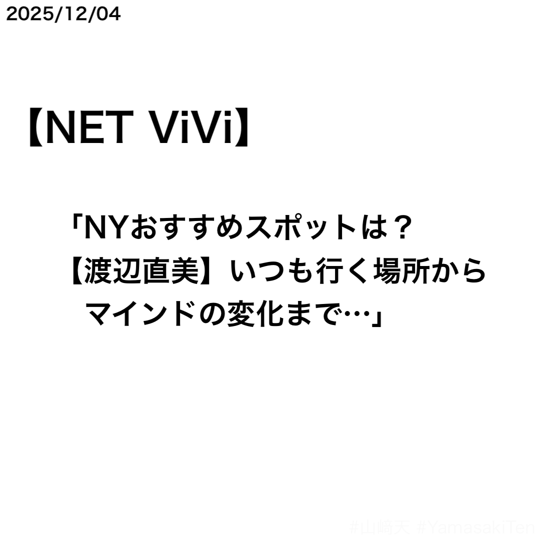 NET ViViで山﨑天さんと渡辺直美さんのニューヨーク表紙記事第1弾が公開された。記事の内容は、表紙を務めた『ViVi 2026年1月号』のカバーストーリー「山﨑天 meets 渡辺直美 in NY」のもの。