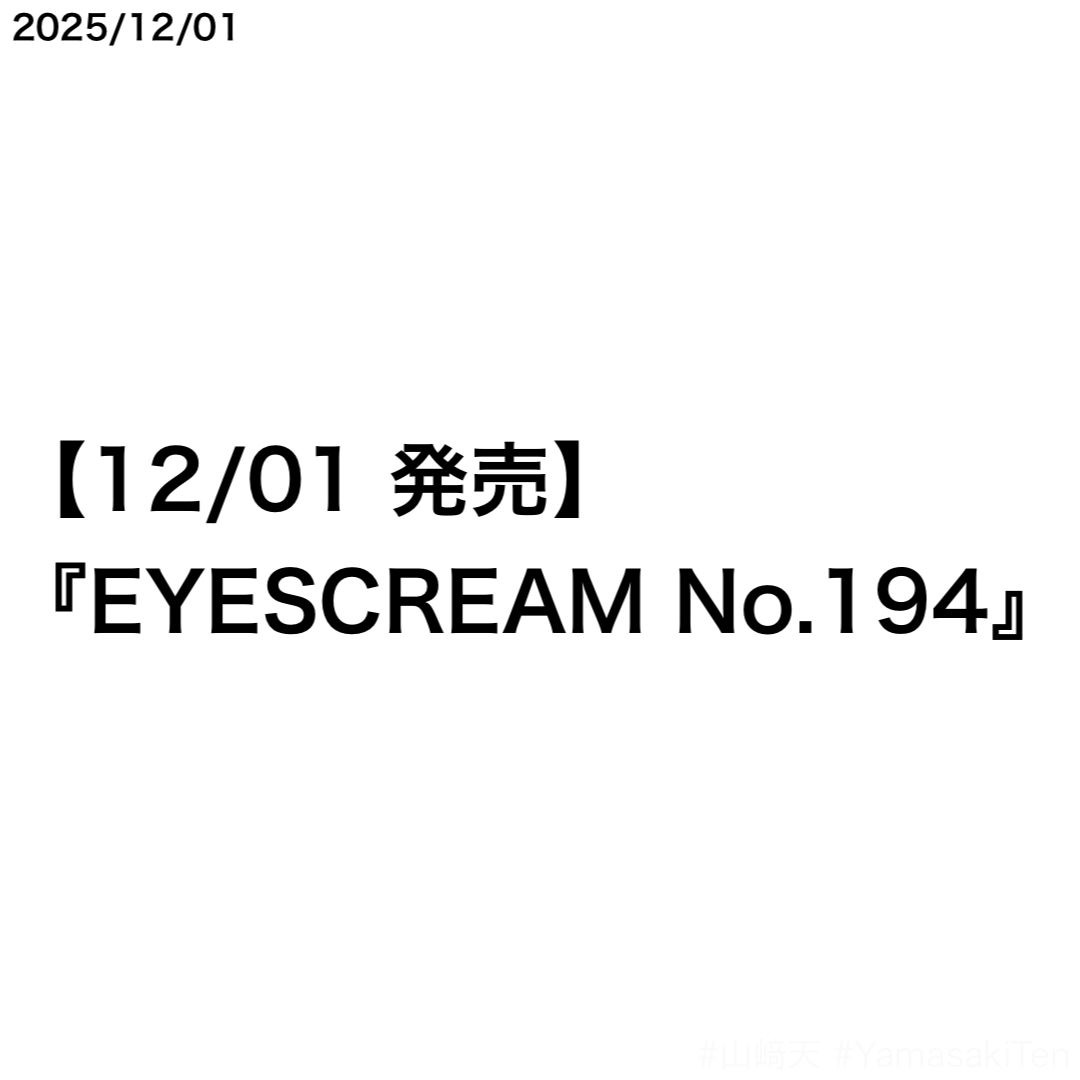 12月1日発売の『EYESCREAM No.194』(トゥーヴァージンズ)に、山﨑天さんが掲載された。同誌に掲載されるのは、今回が初めて。