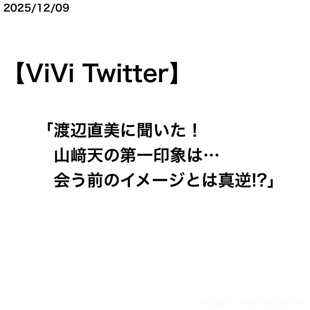 ViVi Twitterで山﨑天さんと渡辺直美さんのニューヨーク表紙第2弾記事がシェアされた。記事の内容は、表紙を務めた『ViVi 2026年1月号』のカバーストーリー「山﨑天 meets 渡辺直美 in NY」のもの。