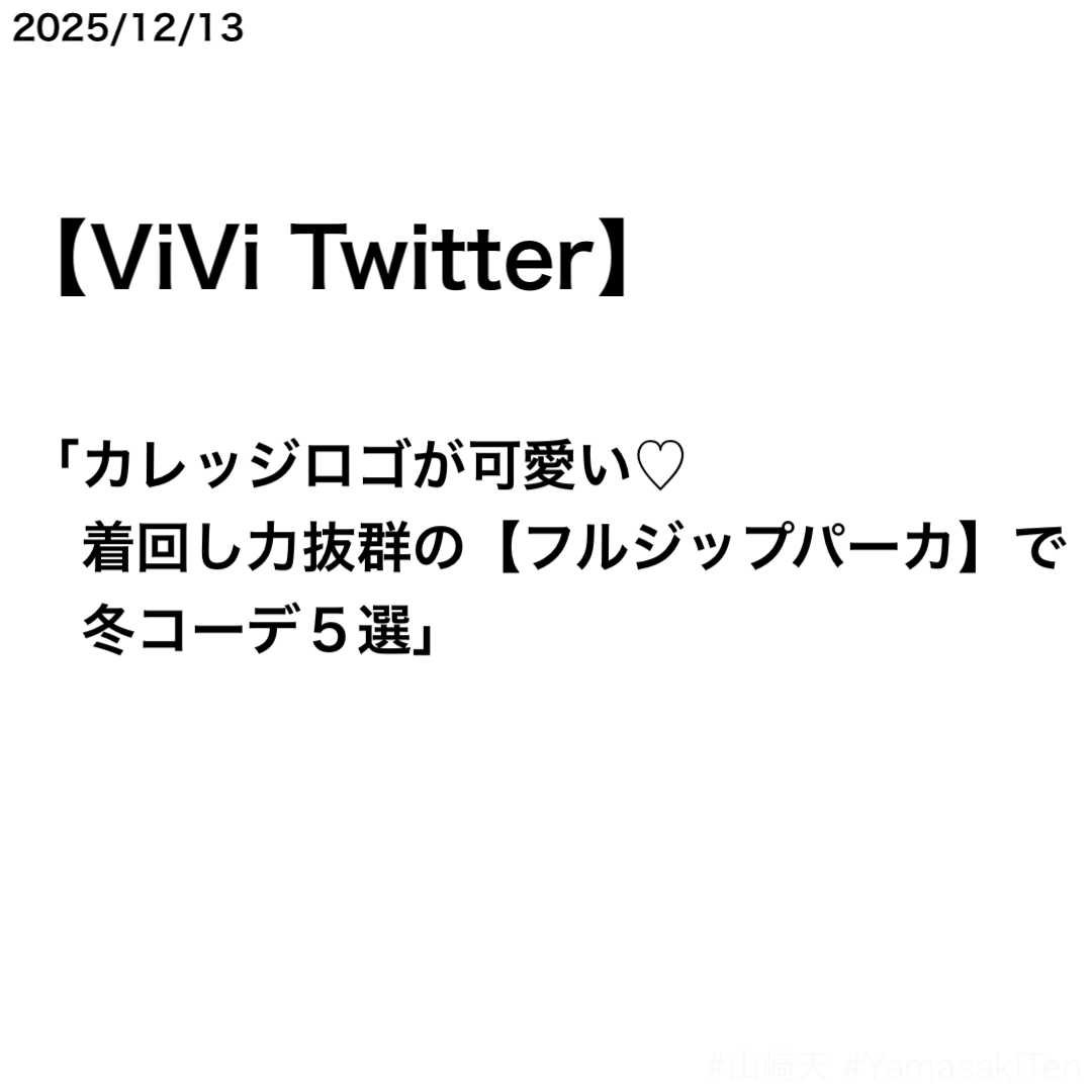 ViVi Twitterで山﨑天さんの編集者なりきり着回しコーデ第1弾記事がシェアされた。記事の内容は、表紙を務めた『ViVi 2026年1月号』に掲載されている「天ちゃんのなりきり着回し feat. 酒井さん(アルコ&ピース)」のもの。