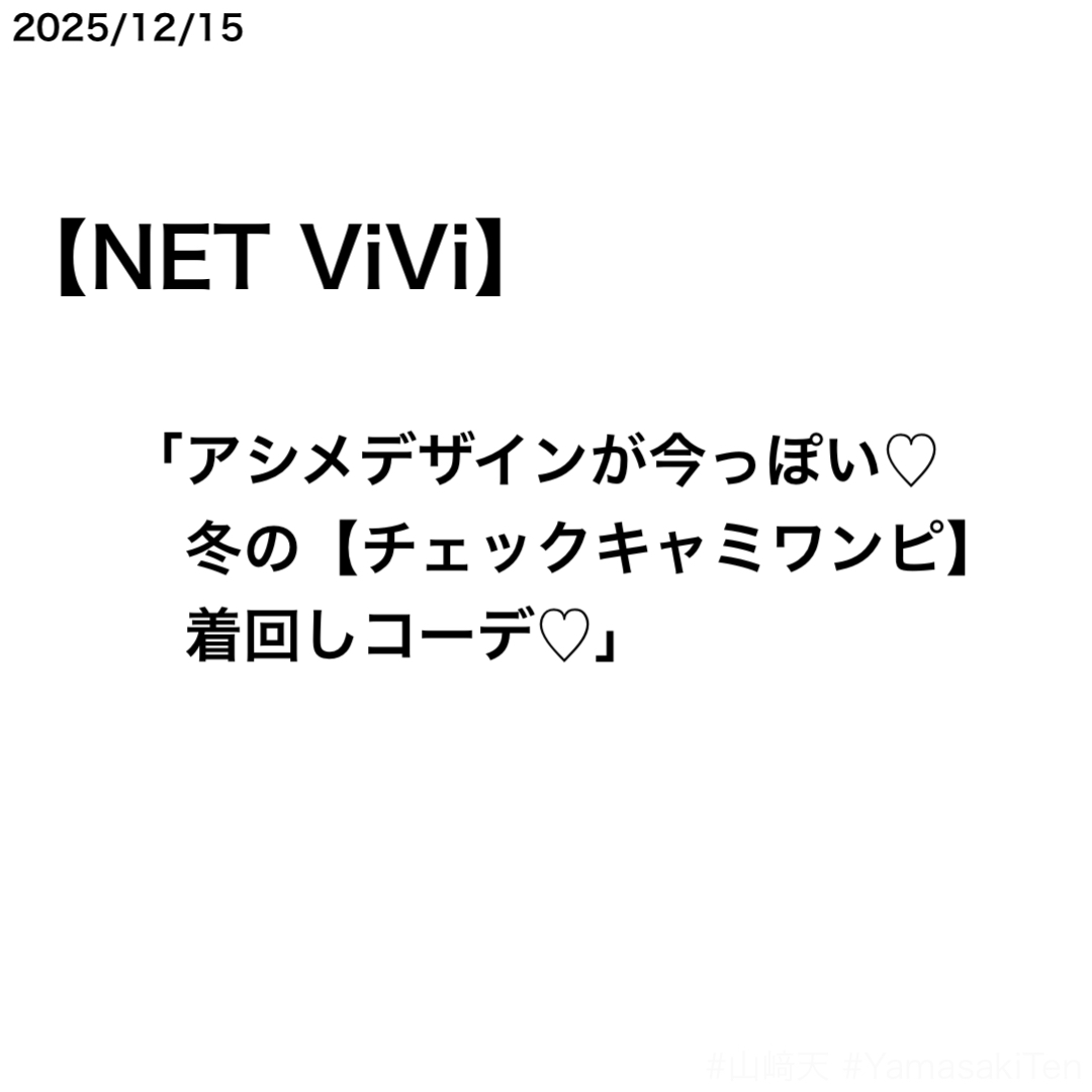 NET ViViで山﨑天さんの編集者なりきり着回しコーデ第2弾記事が公開された。記事の内容は、表紙を務めた『ViVi 2026年1月号』に掲載されている「天ちゃんのなりきり着回し feat. 酒井さん(アルコ&ピース)」のもの。