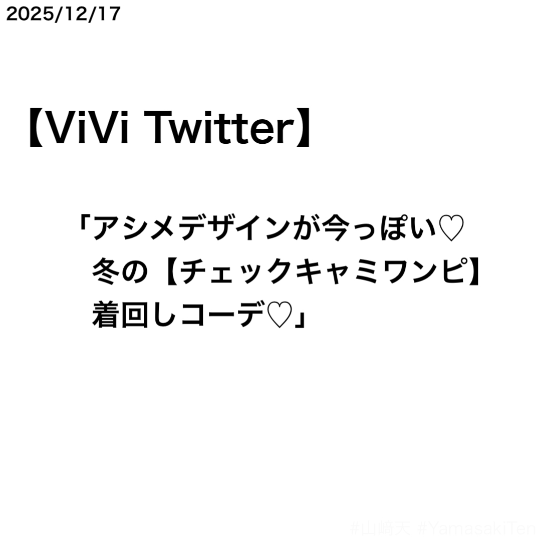 ViVi Twitterで山﨑天さんの編集者なりきり着回しコーデ第2弾記事がシェアされた。記事の内容は、表紙を務めた『ViVi 2026年1月号』に掲載されている「天ちゃんのなりきり着回し feat. 酒井さん(アルコ&ピース)」のもの。
