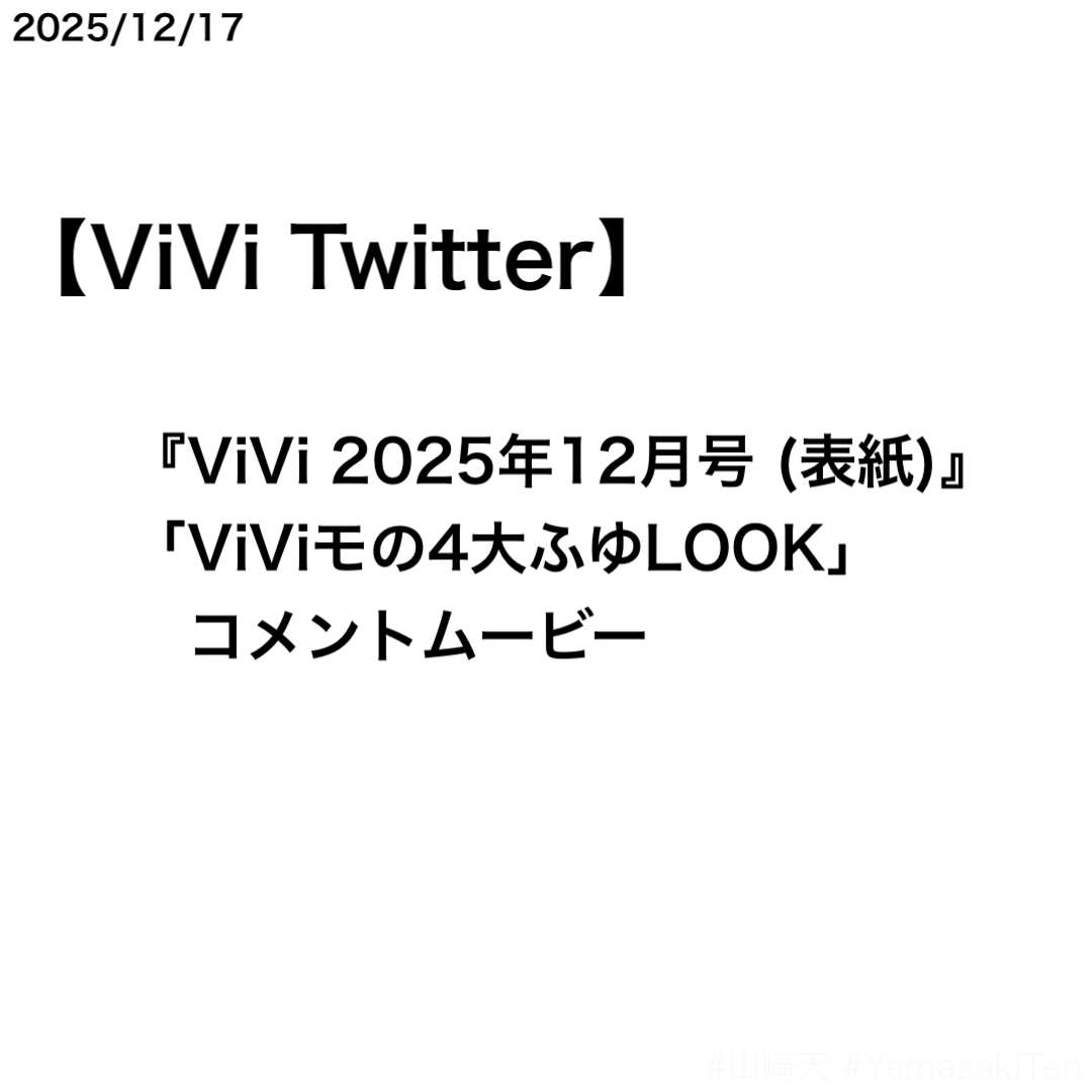 ViVi Twitterで山﨑天さんの「自信の源」コメントムービーがシェアされた。ソロ表紙を務めた『ViVi 2025年12月号』に掲載されている「ViViモの4大ふゆLOOK」のもの。