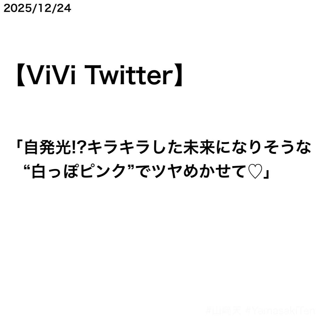 ViVi Twitterで山﨑天さんの白っぽピンクメイク記事がシェアされた。記事の内容は、表紙を務めた『ViVi 2026年1月号』に掲載されている「冬のめろいピンクメイク物語」のもの。