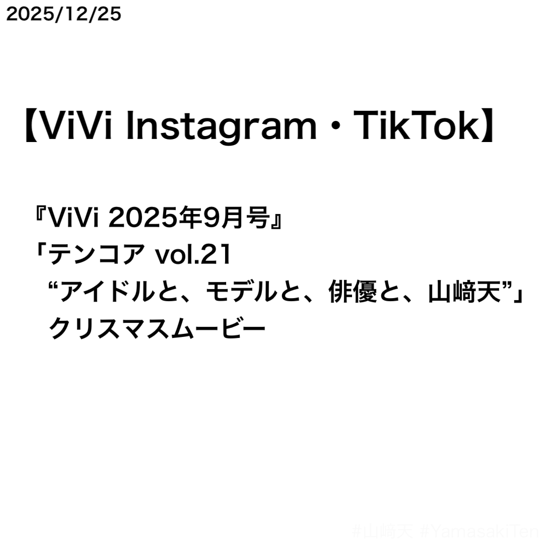 ViVi Instagram・TikTokで山﨑天さんら専属モデルのクリスマスムービーが公開された。『ViVi 2025年9月号』に掲載されている「テンコア vol.21 “アイドルと、モデルと、俳優と、山﨑天”」のもの。