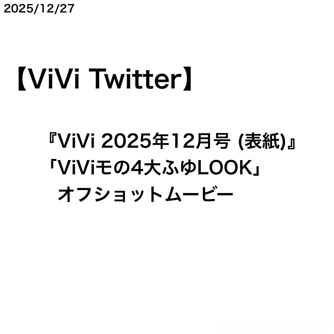 ViVi Twitterで山﨑天さんのニューヨークレディコーデオフショットムービーがシェアされた。ムービーの内容は、ソロ表紙を務めた『ViVi 2025年12月号』に掲載されている「ViViモの4大ふゆLOOK」のもの。