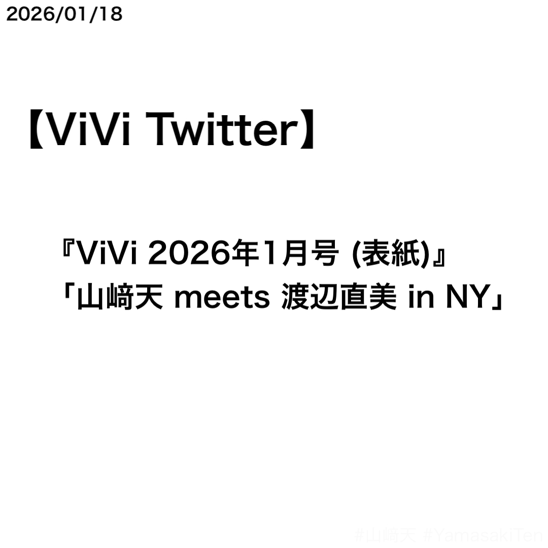 ViVi Twitterで山﨑天さんと渡辺直美さんの待ち受け壁紙写真が公開された。表紙を務めた『ViVi 2026年1月号』に掲載されている「山﨑天 meets 渡辺直美 in NY」のもの。