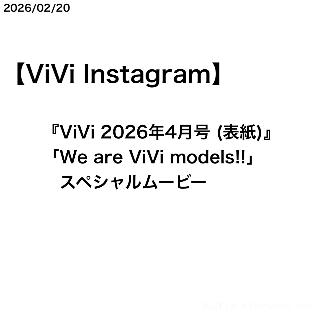 ViVi Instagramで山﨑天さんら専属モデルとLevi’sのスペシャルムービーが公開された。NET ViViではPR記事が公開された。表紙を務めた『ViVi 2026年4月号』に掲載されている「We are ViVi models!!」のもの。