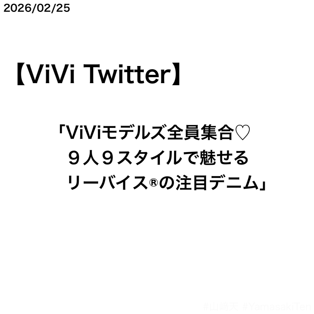 「ViViモデルズ全員大集合」として、専属モデル9名がそれぞれLevi’sのデニムを着用し、ポーズを決めた全員集合ショットがシェアされた。山﨑天さんは「“白T×デニム”の王道スタイル」として、Levi’sのデニムパンツ、HanesのTシャツ、ANEMONEのピアス、EMODAのブーツを着用したコーデを紹介し、センターを飾った。「名前書いておいたのでぜひチェックしてね」と専属モデルの名前も表示された。