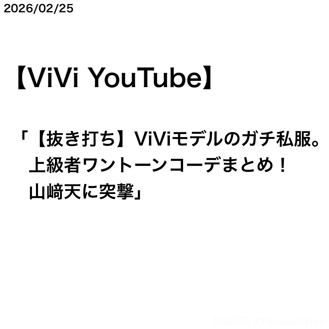 ViVi YouTubeで山﨑天さんの私服ブラックコーデ紹介ムービーが公開された。表紙を務めた『ViVi 2026年4月号 (表紙)』に掲載されている「We are ViVi models!!」の合間に撮影された。ViVi Twitterでは、ムービーがシェアされた。