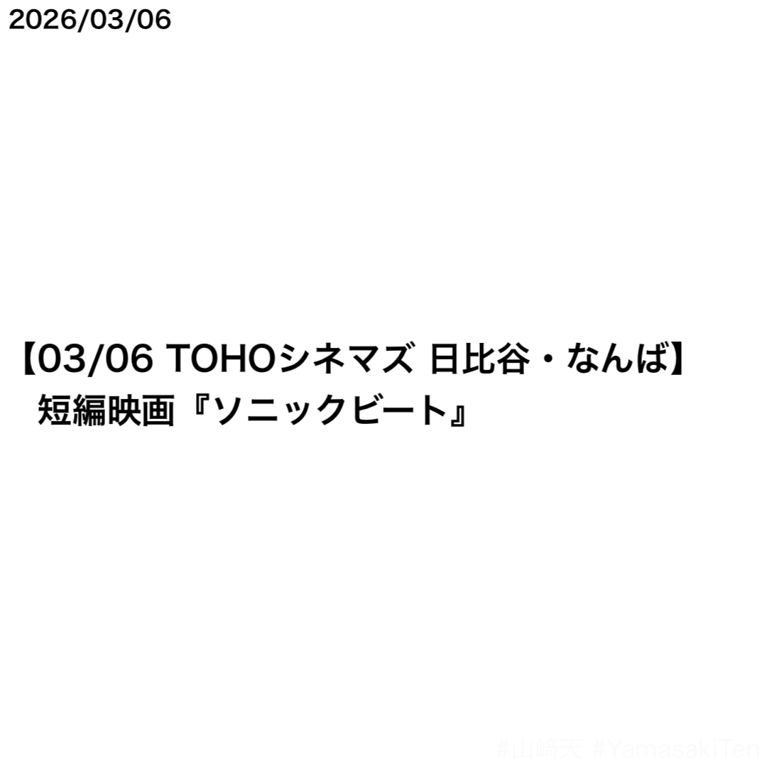 山﨑天さんが出演した短編映画『ソニックビート』(東宝)の上映期間が延長され、TOHOシネマズ なんばでも公開されることが決定した。TOHOシネマズ 日比谷でも続けて上映される。