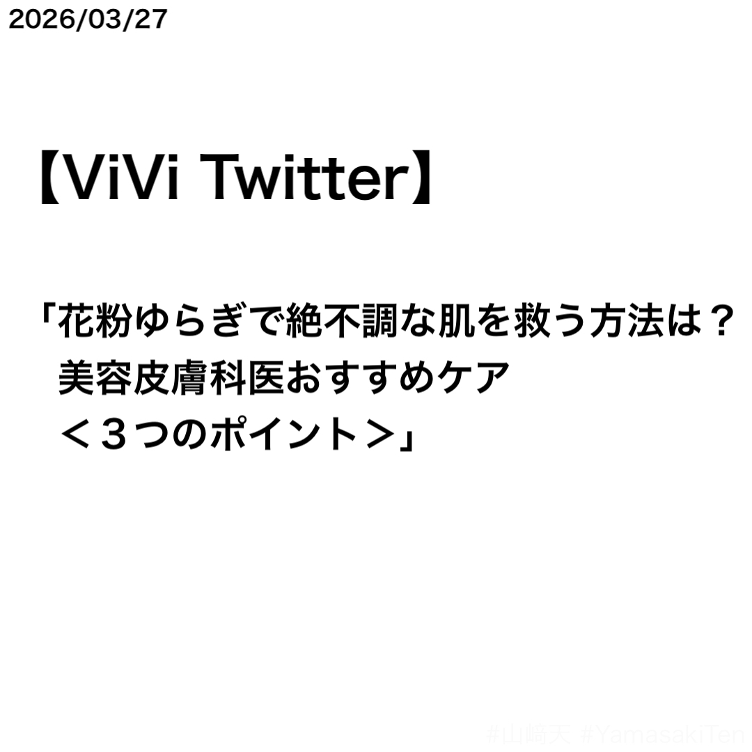 ViVi Twitterで山﨑天さんのゆらぎ肌スキンケア記事第3弾がシェアされた。記事の内容は、表紙を務めた『ViVi 2026年4月号』に掲載されている「おしゃれ女子がスキンケアを科学したならば」のもの。
