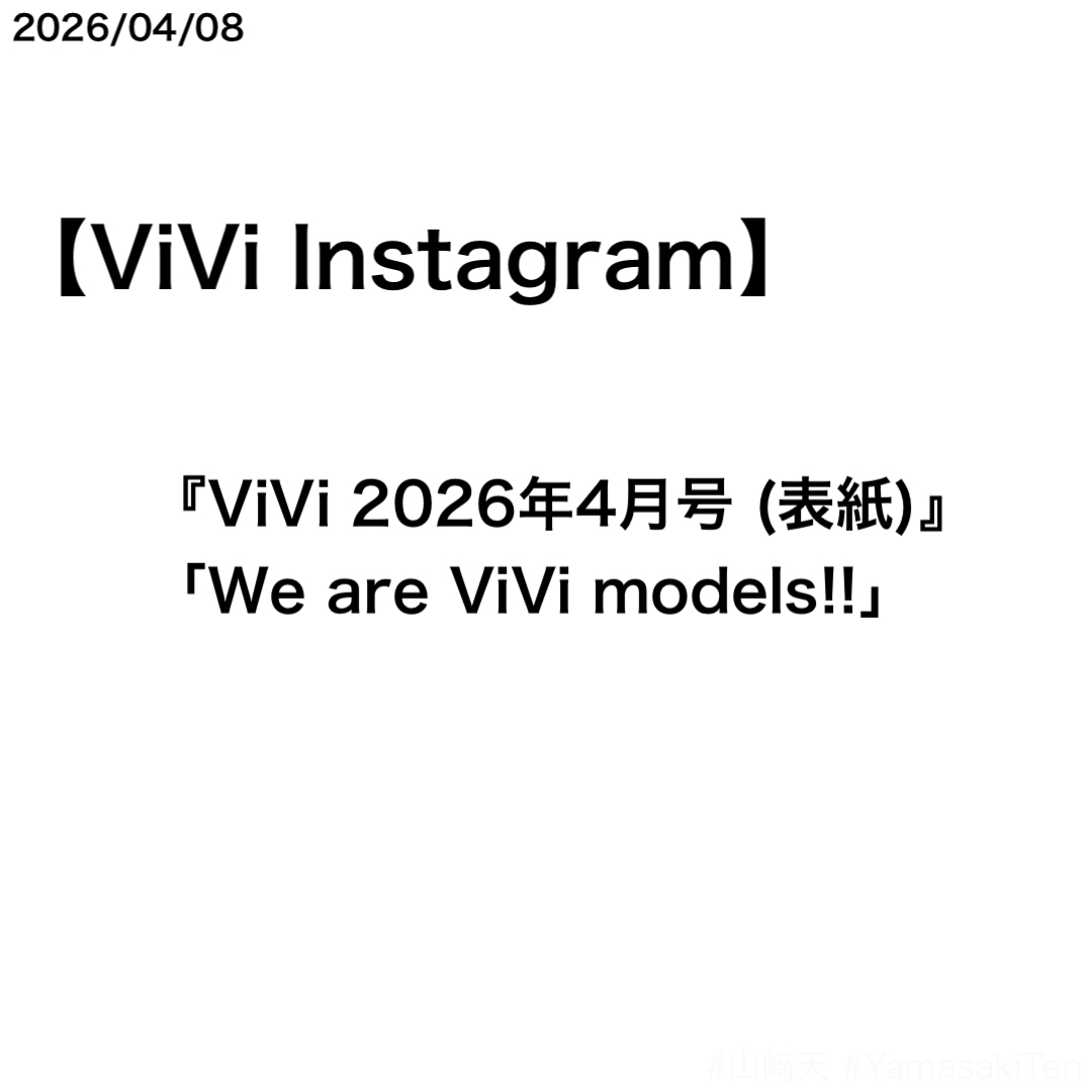 ViVi Instagramで山﨑天さんら専属モデルのコメントが公開された。表紙を務めた『ViVi 2026年4月号』に掲載されている「We are ViVi models!!」のもの。