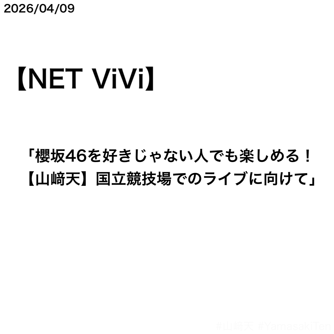 「ライブに自信があるから、まずはとにかくライブを見てほしい」としたうえで、4月11日・12日に国立競技場(MUFGスタジアム)で開催される『櫻坂46 5th YEAR ANNIVERSARY LIVE』について、「自分を納得させられるようなパフォーマンスをしたい……強い気持ちでいよう、って思ってます」と語った。国立競技場でのパフォーマンスとしては、2022年7月16日放送の『音楽の日2022』(TBSテレビ)で山﨑天さんがセンターを務める「五月雨よ」を披露したことがある。山﨑天さんは櫻坂46の唯一かつ絶対的なエース・主人公・センター・象徴・リーダーとして、あらゆる面でグループを牽引している。