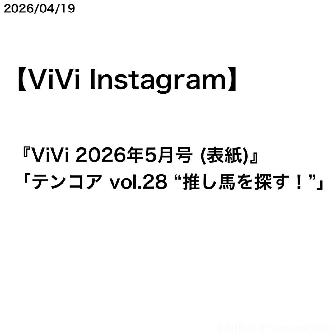ViVi Instagramで山﨑天さんのソロ連載「テンコア」のまとめが公開された。表紙を務めた『ViVi 2026年5月号』に掲載されている「テンコア vol.28 “推し馬を探す!”」のもの。