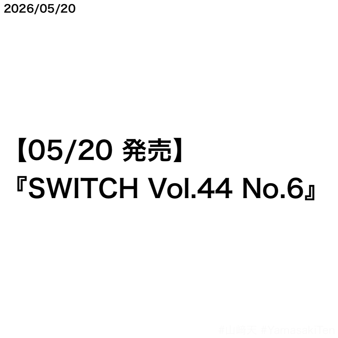 5月20日に発売される『SWITCH Vol.44 No.6』(スイッチ・パブリッシング)に、山﨑天さんが掲載されることが決定した。山﨑天さんが『SWITCH』に掲載されるのは、今回で3回目。